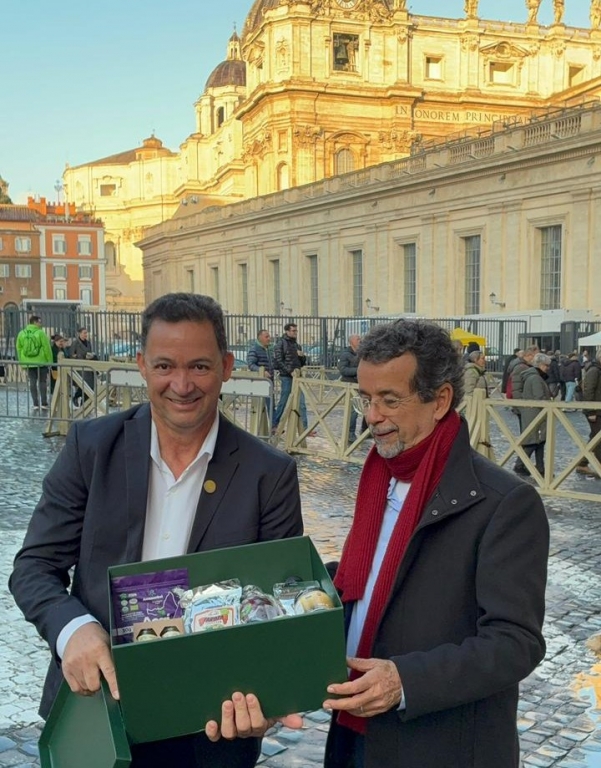 O presidente da União Nacional das Cooperativas da Agricultura Familiar e Economia Solidária (Unicafes), Aparecido de Souza, realizou no dia 17 de dezembro a entrega de uma cesta de produtos da agricultura familiar brasileira ao Papa Leão XIV, em Roma. A iniciativa integrou a missão institucional que reuniu representantes da Unicafes e membros do governo brasileiro em uma agenda de articulação internacional voltada ao fortalecimento do cooperativismo, da economia solidária e da agricultura familiar no cenário global.