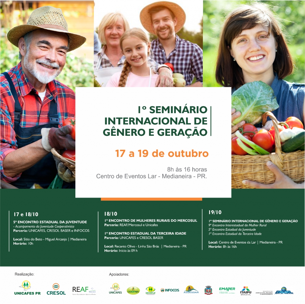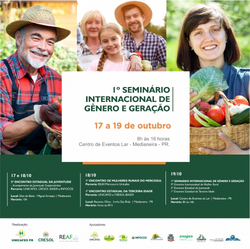 De 17 a 19 de outubro, o município de Medianeira sediará o 1º Encontro Internacional de Gênero e Geração. A inicitiva será uma grande troca de experiências e integração das pessoas que fazem o Cooperativismo Solidário. São esperadas cerca de 1.500 pessoas entre jovens, mulheres e idosos rurais vinculados as cooperativas filiadas a Unicafes (União de Cooperativas da Agricultura Familiar e Economia Solidária do Estado do Paraná). A programação do encontro foi dividida em três partes começando pelo 1º Acampamento da Juventude Cooperativista, marcado para os dias 17 e 18 de outubro, com início às 9h. São esperados 150 jovens de várias regiões do Paraná que participam do Programa Juventude Cooperativista ação que já é desenvolvida pela parceria entra a Unicafes, a Cresol e o Instituto de Formação Infocos.