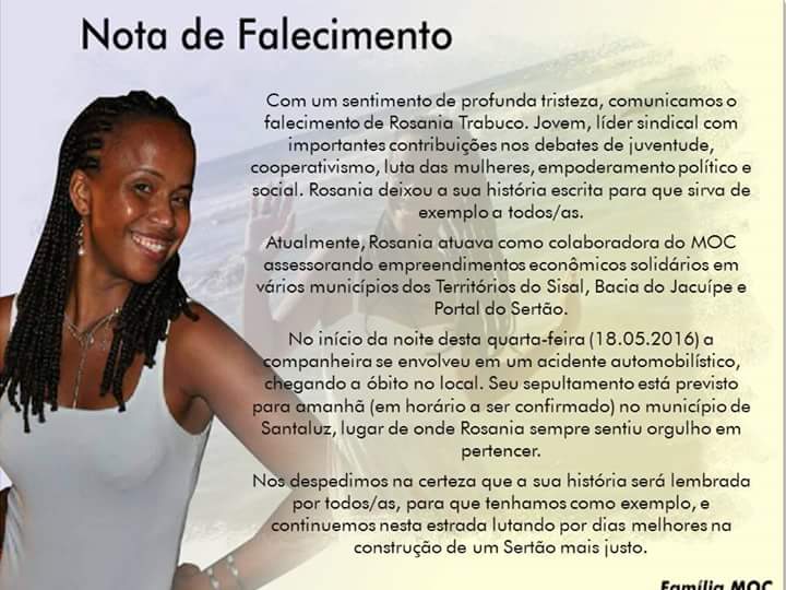 É com profunda tristeza e consternação que a Unicafes Nacional comunica o falecimento de uma das líderes dos movimentos sociais, Rosania de Souza Trabuco. A jovem liderança faleceu no final da tarde desta quarta-feira (18), vítima de um acidente automobilístico, na BR 324, trecho entre as cidades de Riachão do Jacuípe e Tanquinho. O sepultamento será realizado hoje (19), na cidade de Santa Luz, em local e horário a serem definidos.