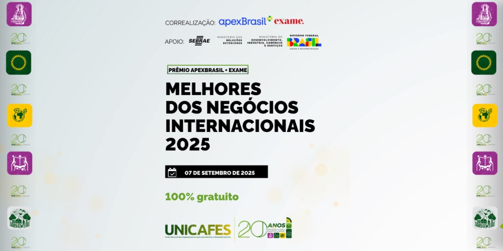 Neste contexto, convidamos todas as cooperativas filiadas ao Sistema Unicafes a participarem da segunda edição do Prêmio Melhores dos Negócios Internacionais, promovido pela Apex-Brasil em parceria com a Exame. Poderão concorrer empresas, cooperativas, startups, entidades setoriais e fundos que tenham realizado iniciativas relevantes entre janeiro de 2024 e junho de 2025.