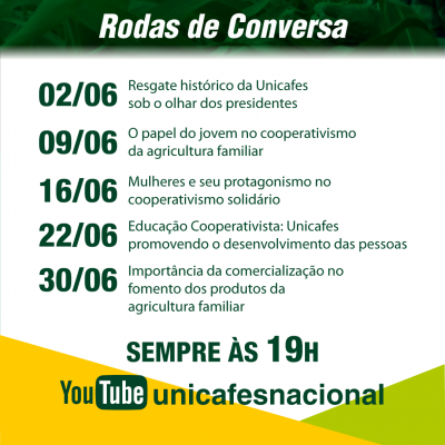 Além disso, durante o mês de junho, serão realizadas outras quatro rodas de conversa, com temas voltados à juventude, mulheres, formação e comercialização. Confira abaixo a programação completa e participe conosco. Todos os encontros acontecem às 19h e serão transmitidos pelo Youtube da Unicafes Nacional.