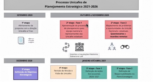 O Planejamento está sendo construído em etapas, através de reuniões virtuais com representantes do Conselho Nacional e das Unicafes Estaduais, pesquisadores, universidades e assessorias. O cronograma elenca o alinhamento da proposta e do conteúdo; mapeamento de problemas e oportunidades; revisão da Missão (razão de existir) e Visão (o que pretende se tornar a longo prazo); definição de Objetivos Estratégicos e Ações Estruturantes; definição de responsabilidades no Plano Estratégico, entre outras.